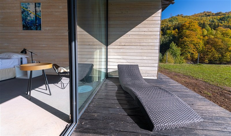 Cele 10 camere ale pensiunii sunt intim ascunse in panta malului si permit vederea neobstructionata spre lac, prin geamurile largi si de pe terasa privata a fiecarei camere. Suprafata vitrata mare creaza impresia ca natura de afara se contopeste cu interiorul.