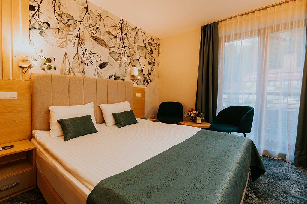 Camerele twin sunt dotate cu doua paturi separate de 1 persoana iar Camerele matrimoniale sunt dotate cu un pat dublu de o dimensiune de 160 x 200 cm si beneficiaza de vedere catre munte sau catre pdure, iar o parte dintre ele au balcon. In camerele fara balcon este posibil asezarea unui pat suplimentar (contra cost). In cazul in care sositi insotiti de copii, la tariful camerei se vor adauga costuri suplimentare in functie de varsta copiilor. Animale de companie se accepta doar pe baz de solicitare, in camerele de la etajul 1, contra cost.